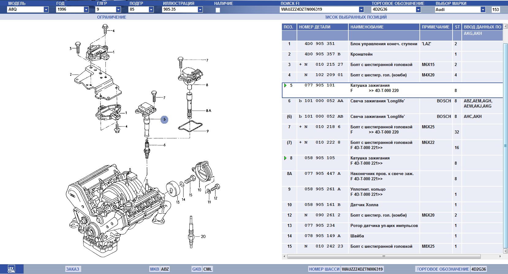 комрады, нужны номера на катушки зажигания и клапан холостого хода на А8 Д2 4,2 ква ABZ мотор