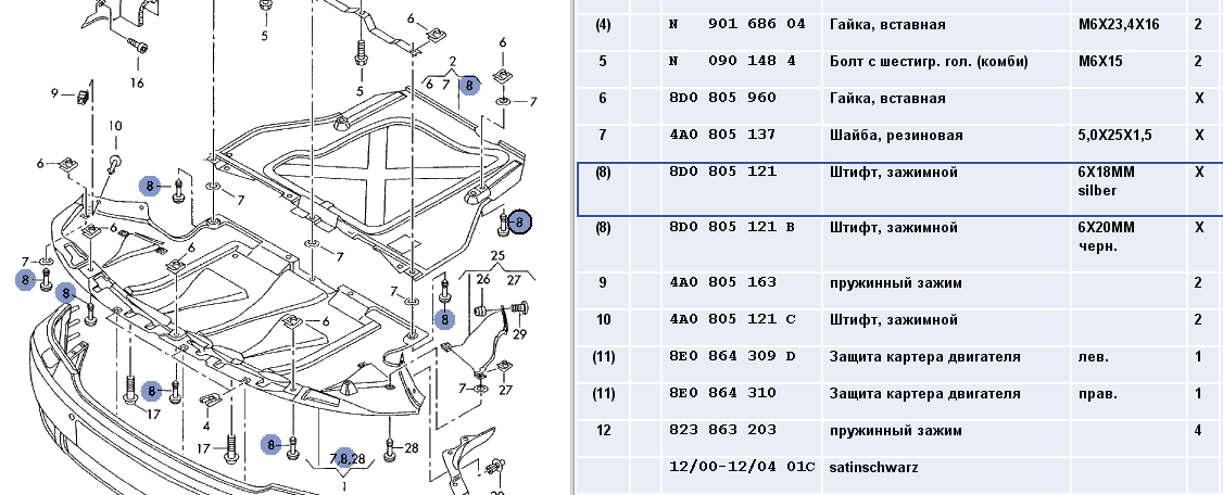 защита двигателя; - тут есть два варианта 1. 4A0 863 821 AG, 2. 4A0 863 821 AM - для а/м сгрязезащитным щитом двигателя подогн. с пом. инстр. автосер.