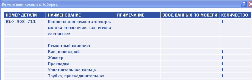Состав комплекта для ремонта мотора стеклоочистителя заднего стекла 8L0 998 711