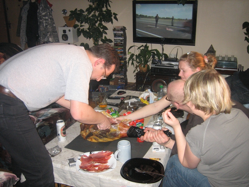 читал я матчасть про хамон. Этикетку сразу выкинул. Фольга на копыте была черная. Разбираться сейчас - из дорогих был или нет - не буду - это был подарок. Резали - ну, в первый раз - сам понимаешь - как получилось. Вместо подставки - сестрин муж. Шкурку сняли, начали правильно строгать тонкими-тонкими ломтями. Опыта, общем, не было - но проникся по полной программе. Резал двумя ножами - побольше и поменьше.