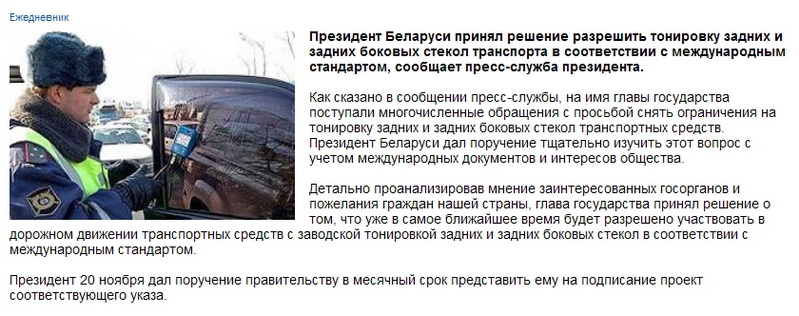 Пошел слух, что сегодня А.Г. подписал указ (а может и не указ, но какой-то документ) о внесении изменений в ПДД, касающихся тонировки авто, якобы после его вступления в силу, будет разрешено тонировать заднее и задние боковые стекла авто без ограничений по светопропусканию, светопропускание передних стекол должно быть не менее 70% (вообщем все так же как прописано в европейских нормах)