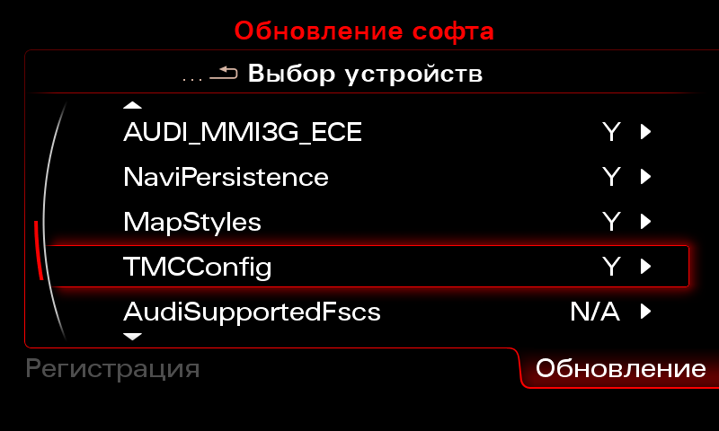 Теперь запустив обновление заново можно будет выбрать режим "определённый пользователем" и вручную указать, что необходимо обновить. Нам нужны следующие разделы: AUDI_MMI3G_ECE, NaviPersistence, MapStyles и TMCConfig. В каждом из них нужно поставить галочку напротив "Application":