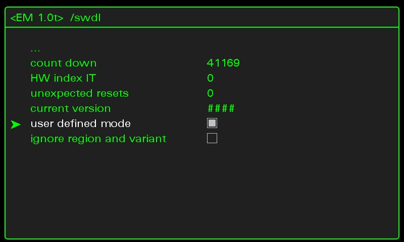 Вставляем SD карту в слот №1. Все лишнее отключаем/вынимаем (SIM-карты, AMI устройства, диагностические адаптеры). Запускаем процесс обновления, появляется номер и версия обновления, продолжить, список устройств для обновления, прокручиваем вниз и ... не подсвечивается строчка "Начать обновление" Значит нужно обновляться вручную. Чтобы активировать возможность обновления в пользовательском режиме нужно активировать "user defined mode" в "зелёнке". Для этого идём в "Зелёное меню" (MENU+CAR) - swdl - user defined mode: