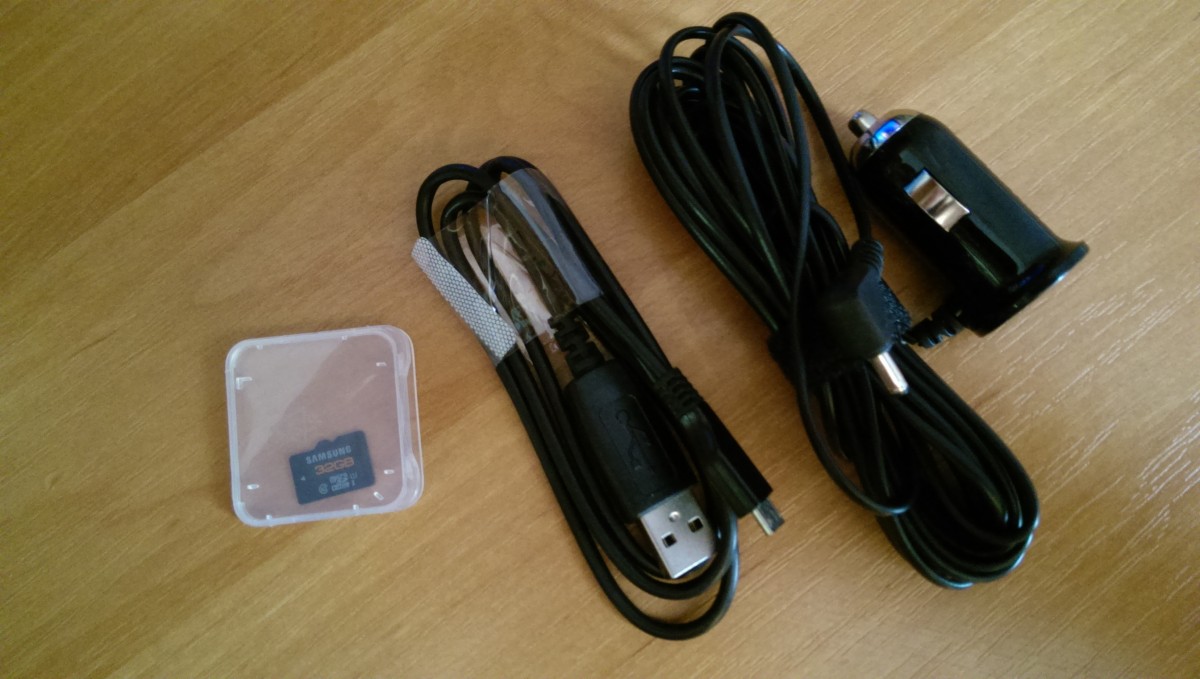 В другом - кабель питания, USB-кабель и карта памяти на 32Gb 10-го класса