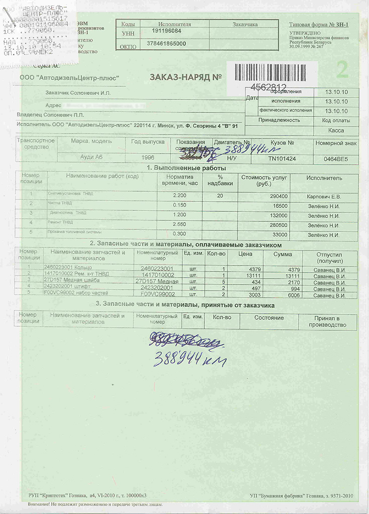 Последний раз обратился к ним с просьбой устанить течь ТНВД (заменить уплотнения) и попутно провести его диагностику. Работы по заказ-наряду № 4 562 812 от 13.10.2010г были сделаны своевременно и к их качеству серьёзных нареканий у меня не возникло: забыли вкрутить один крепёжный винт из 3-ёх.