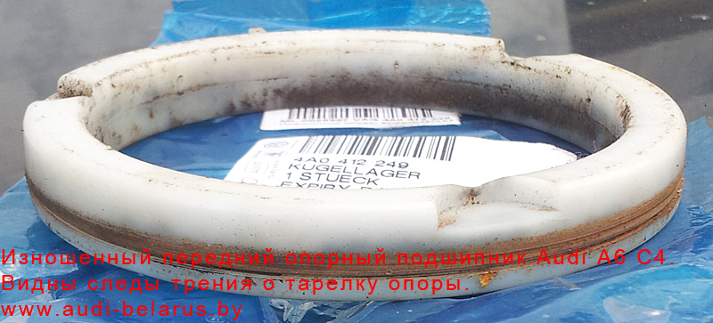 чётким и регулярным. Мастер сказал, что из-за этого стойку несколько раз разбирали и заново собирали, но звук не исчез. Вердикт ― нужно заменить:- Тарелку пружины передней верхнюю 4A0 412 111B.