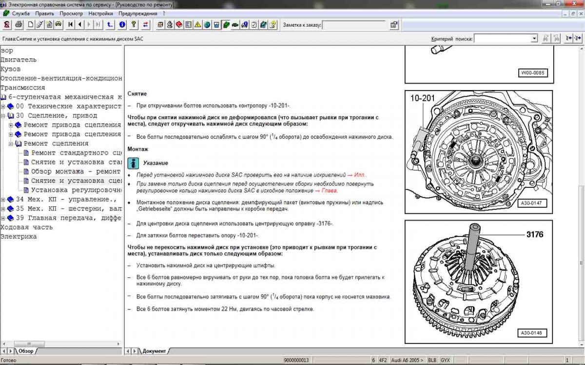 Не знаю, как в более поздних версиях, но в Elsa 4.10 не в полном объеме описана установка сцепления с саморегулирующимся нажимным диском SAC (производитель LuK). Если устанавливать как описано в руководстве - сцепление работать не будет (нажимному диску не будет достаточно расстояния для разъединения фрикционного диска - не получиться включить передачу). Для установки нажимного диска (корзины) его нужно "зарядить" с помощью специальной приспособы, т.е. задать крайние положения. А в Elsa не описано как это сделать :cry: :cry: :cry: