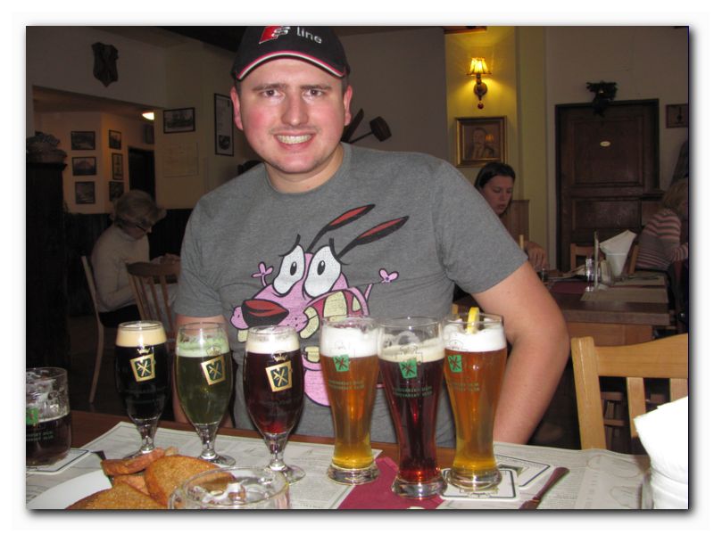 После башни и осмотра верхнего города мы спустились вниз по серпантину и сев в трамвай проехали, разумеется бесплатно, до первого пивного заведения - "Pivovarsky dom" Должен отметить, что именно в нем мне подали за сегодня самое лучшее пиво, которого у них аж 8 видов. Официантка переспросила :D меня дважды, когда я попросил принести все 8 видов в бокалах по 0.33. Стоимость каждого бокальчика - 40 крон, что очень дорого на уровне остальных ресторанов (25 крон за кружку 0.5 л), но оно того стоило. Про меню к пиву даже упоминать не буду - все настолько вкусное, что выбирать очень сложно. Кстати, везде где довелось побывать, всегда приносили меню на чешском/английском и отдельно на русском языке.