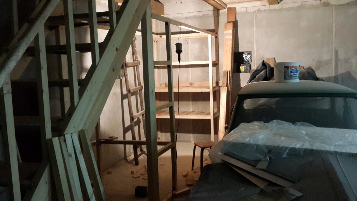 Потихоньку двигаемся. Жалею, что возле самого входа не поставил металлический шкаф для одежды - а ведь был. Планирую половину стола закрыть железом, а оставшуюся часть - столешницу из ДВП или фанеры.