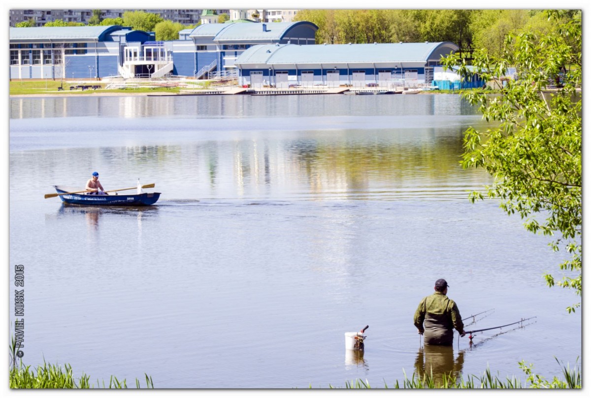 Словно составляя ему компанию, "работают" рыбак и спасатель в лодке: