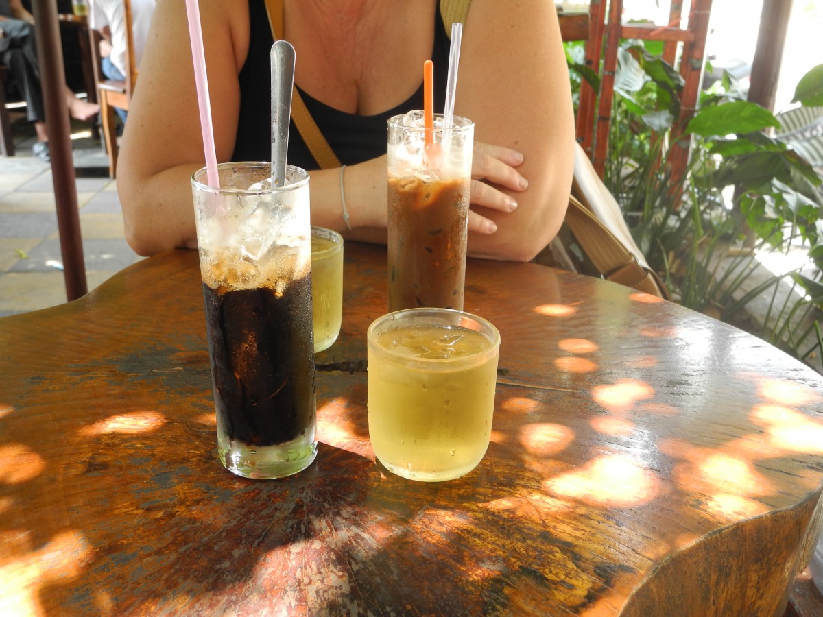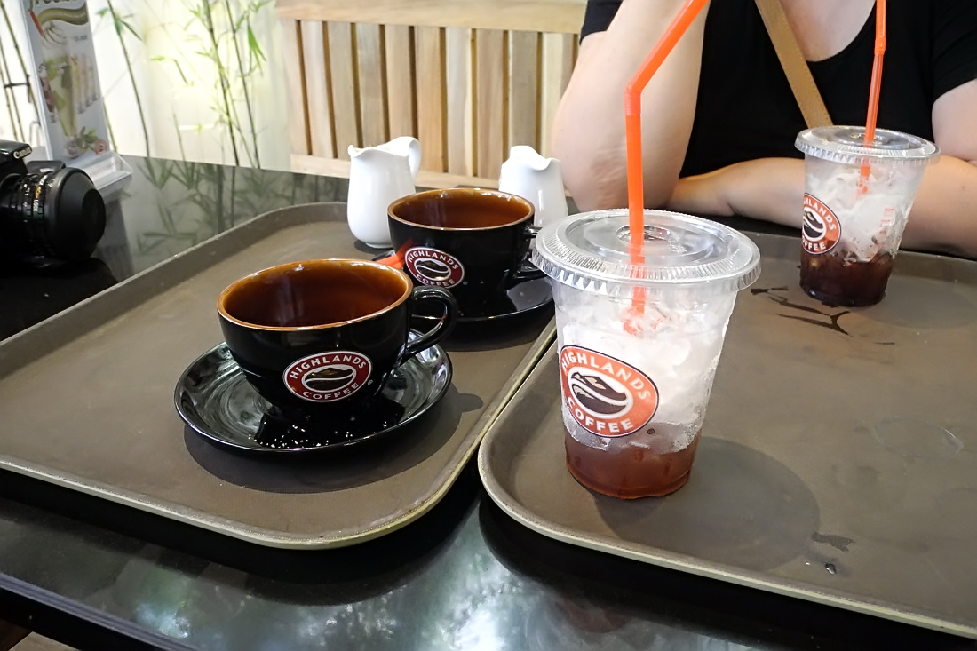 Но потом принесли кофе местному и я увидел сам процес приготовления. Секрет в способе заваривания. Здесь кофе заваривают в специальном фильтре который ставится на чашку. В этот фильтр насыпают 3 ложки вьетнамского кофе, потом прессуется такой крышечкой с мелкими дырочками и поверх всего наливается 20мл кипяченой воды чтобы она пропитала кофе,затем доливают 45мл воды , сверху накрывается крышкой и эта вся конструкция ставится на чашку. Т.е. это как электрокофеварка только без давления. Минут 10 это все просачивается и к чашке получается очень ядерная концентрация кофе. Затем в чашку засыпается 2-3 ложечки сахара, размешивается и выливается в стакан, на 2/3 заполненого льдом. Лед мгновенно остужает кофе и получается ice coffee. Но вкус все таки определяет вьетнамский кофе.