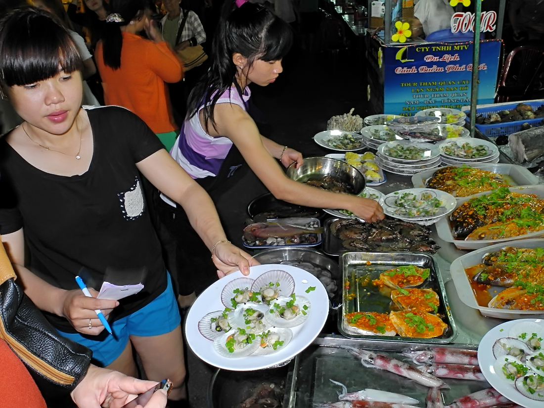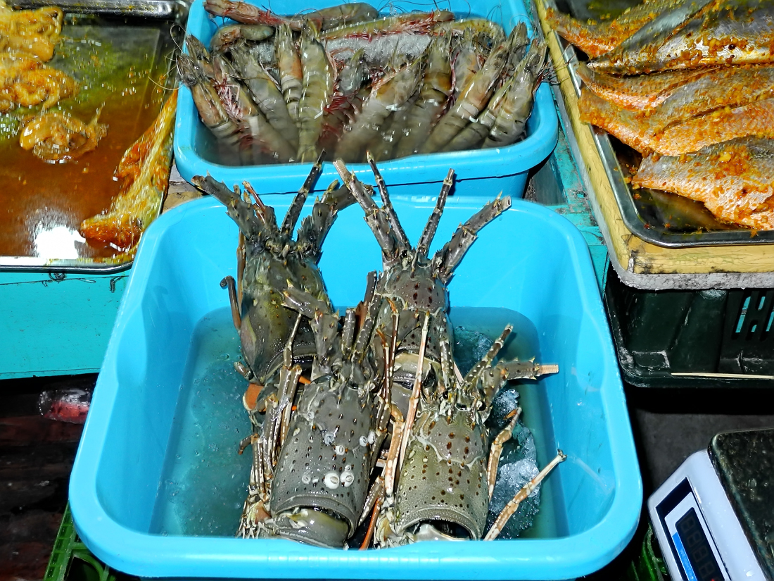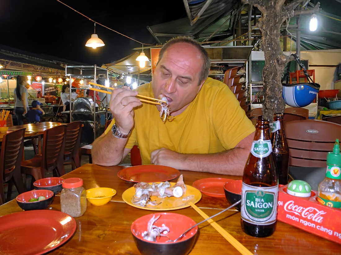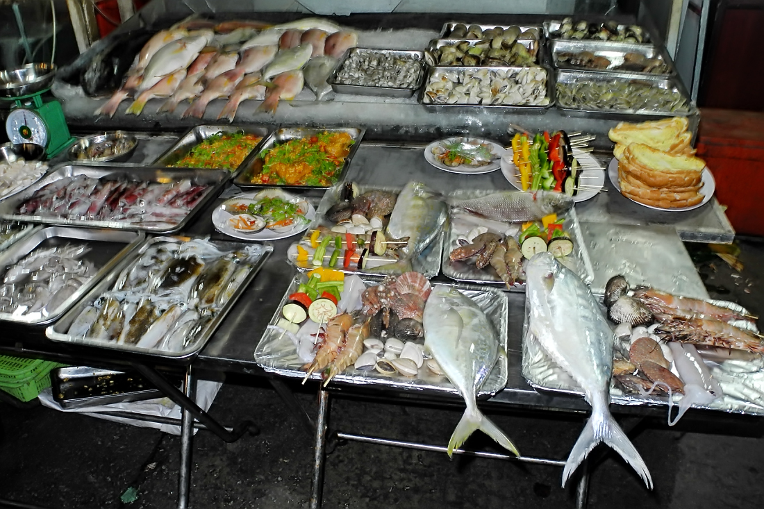 Собственно рынок крытый работает и днем, как вещевой, а ночью на улицу раскрадываюстя столы , мангалы, палатки, шмотки и начинается обжираловка всяких кусняшек. длится это до послеполуночи. Здесь единственный раз возле жены стали тереться карманники, но пару слов и моя комплекция подействовала положительно. Не удержались, что бы не сьесть тарелку тигровых креветок