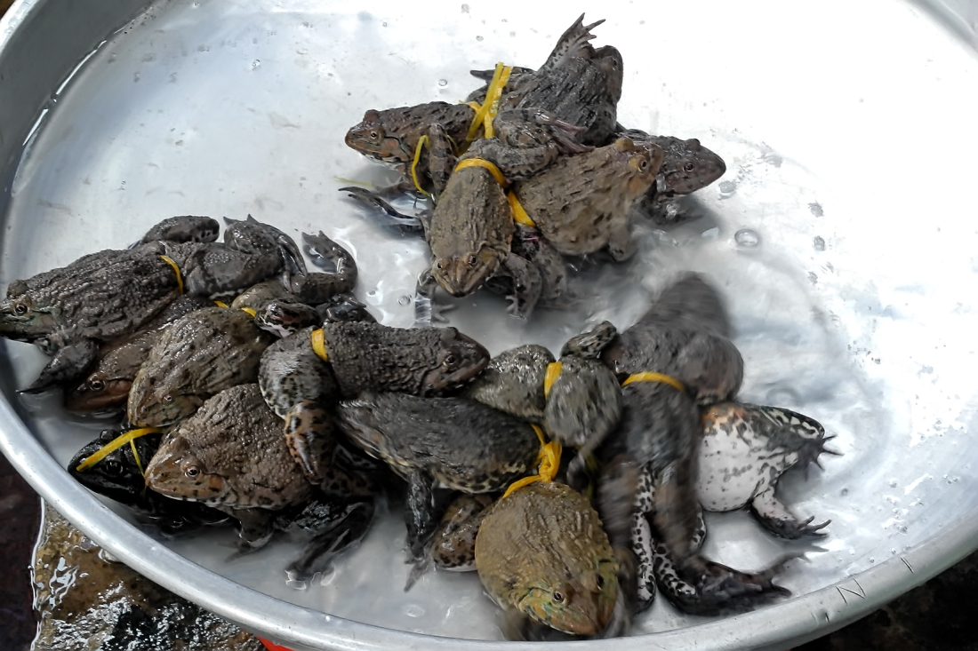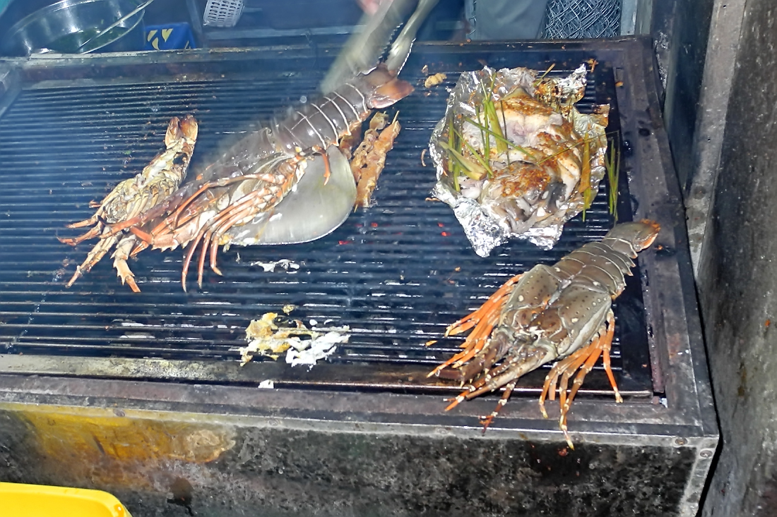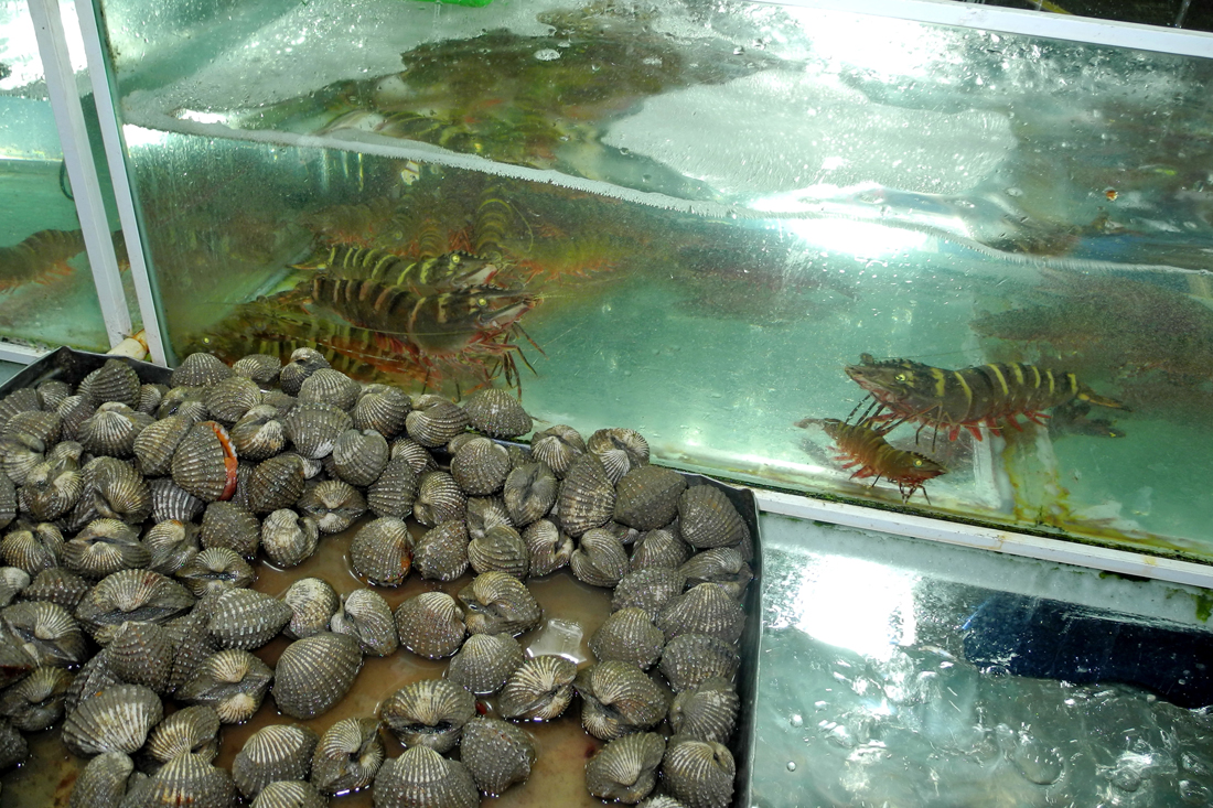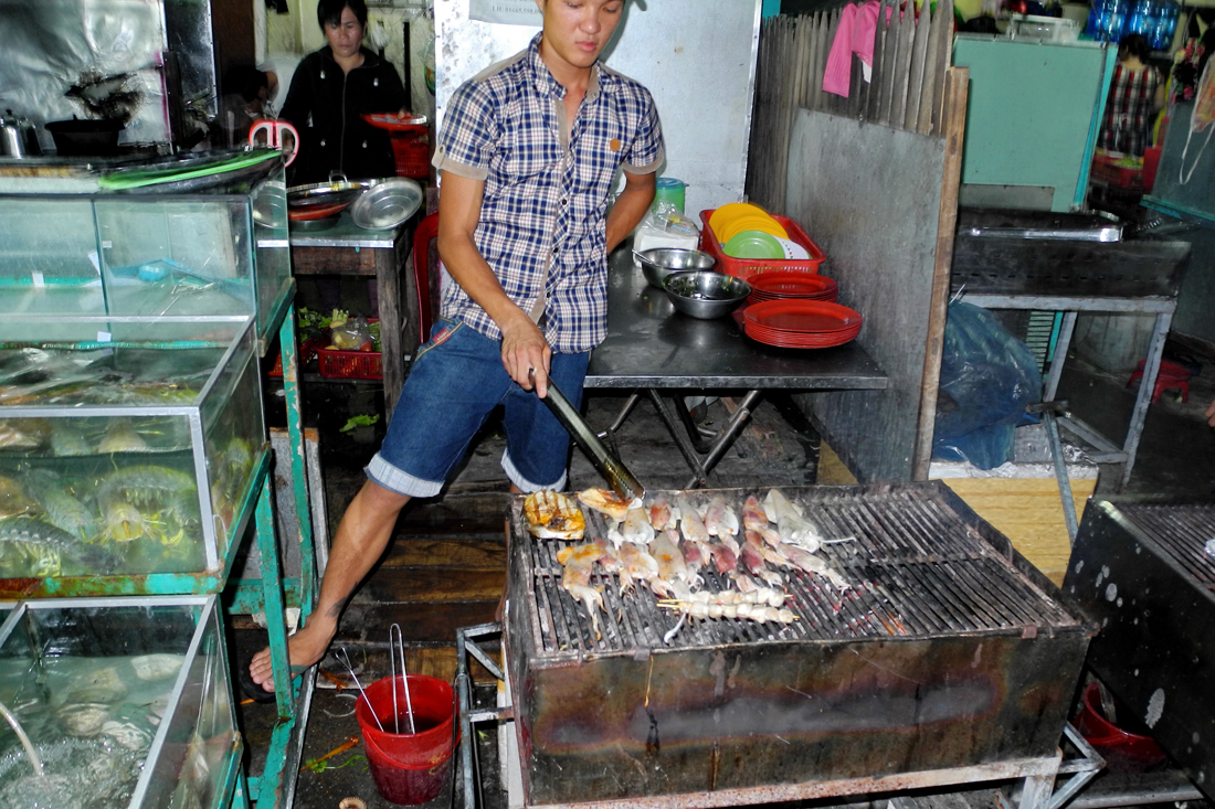 Собственно рынок крытый работает и днем, как вещевой, а ночью на улицу раскрадываюстя столы , мангалы, палатки, шмотки и начинается обжираловка всяких кусняшек. длится это до послеполуночи. Здесь единственный раз возле жены стали тереться карманники, но пару слов и моя комплекция подействовала положительно. Не удержались, что бы не сьесть тарелку тигровых креветок