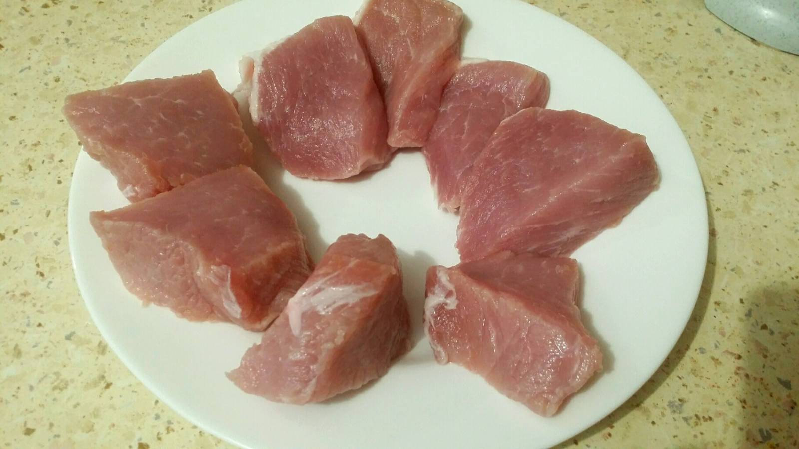 Занялся мясом. На двоих свиная шея 400 гр. Нарезал на правильные куски: