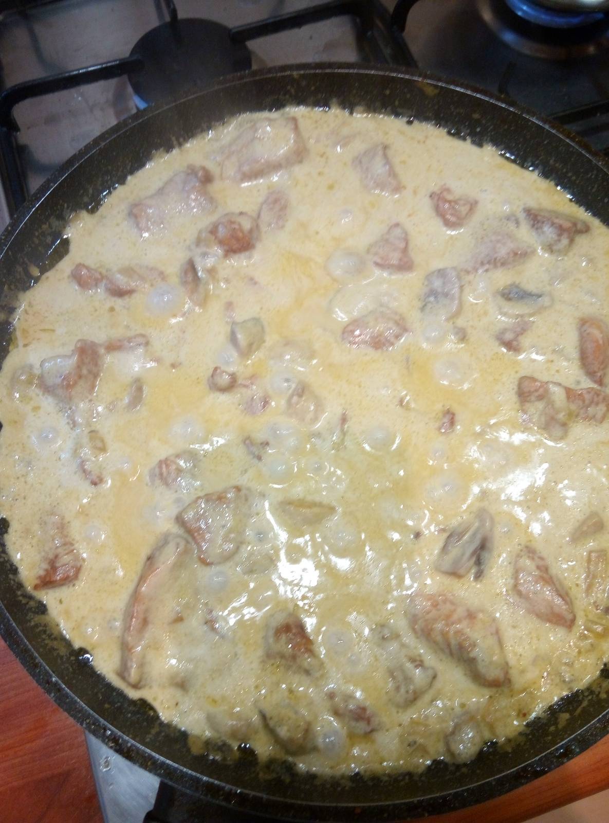 Филе порезал на кусочки (достаточно крупные). Начистил и порезал -лук,2 зубчика чеснока,шампиньоны. Сметана 26%. Отварной рис. Вот как то так