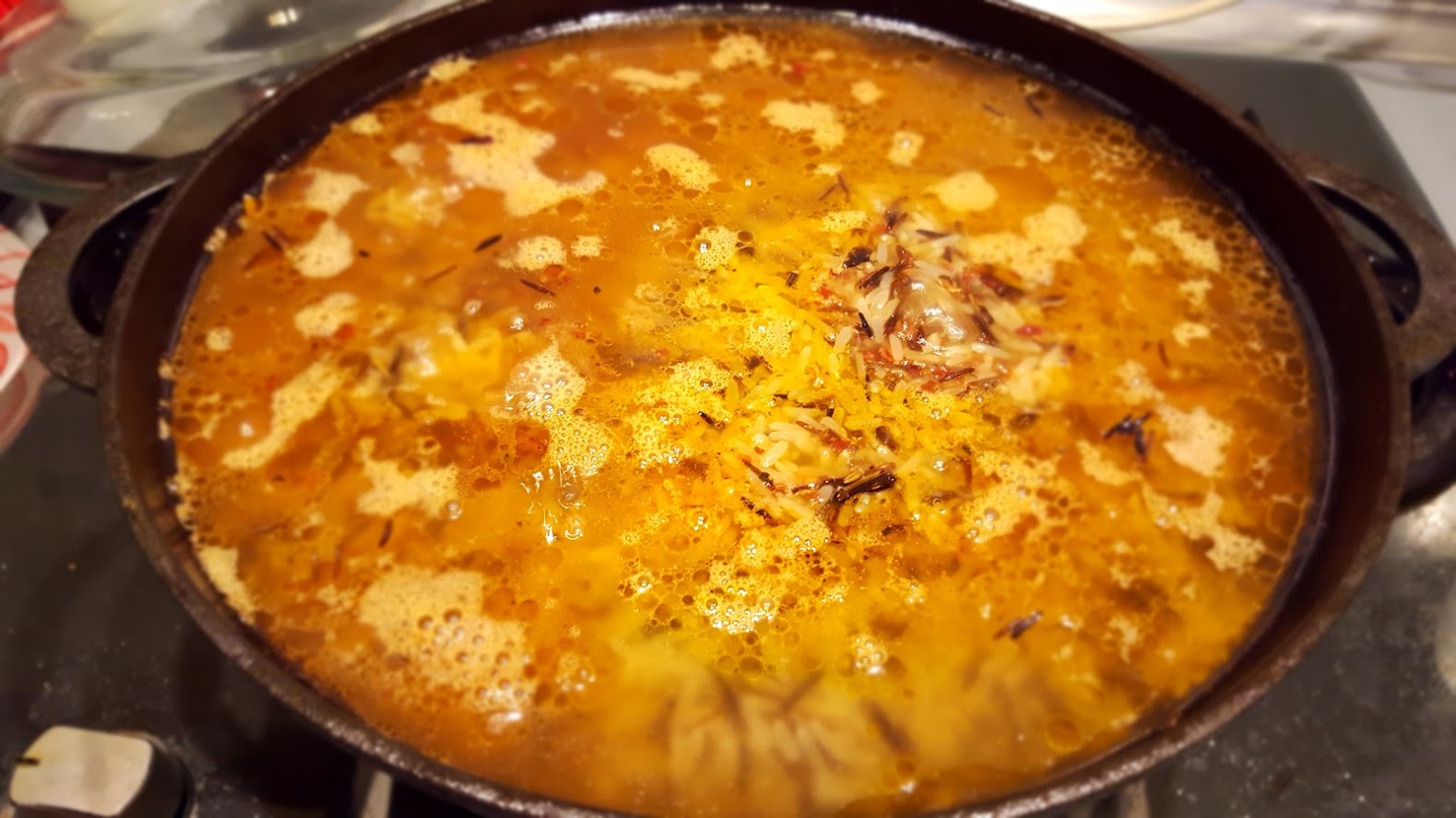 4. Вскипятить отдельно 1.5 литра кипятка, убрать крышку, сделать максимальный огонь. Слить воду из риса и выложить его сверху на морковь. Залить аккуратно всё кипятком - главное что бы мясо осталось внизу, на поверхность всплывёт жир и масло. Главное ничего не перемешивать, всё начнёт кипеть.