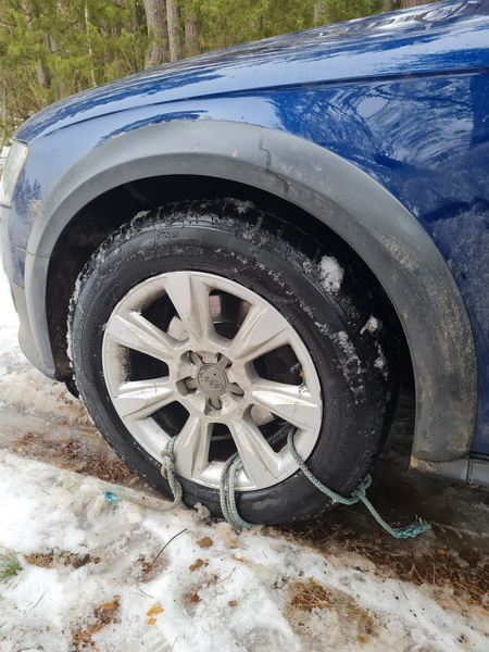 Щёткой выгребал снег минут 30, чтобы машина хотя бы раскачиваться начала поперёк - изначально висела на пузе и вообще не шевелилась за релинги. Верёвка на колёса и своим ходом выехал назад. Хотел снять, как это будет. Сел попробовать, поедет ли, а она так бодро рванула, что я уже не останавливался.