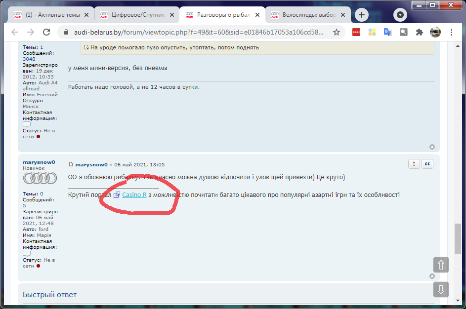 Убрал спам из якобы подписи (выглядело как подпись к профилю) и удалил остальные бесполезные сообщения. А ведь спамер не совсем дурак ― когда размещал первое сообщение то ссылки на казино не было.