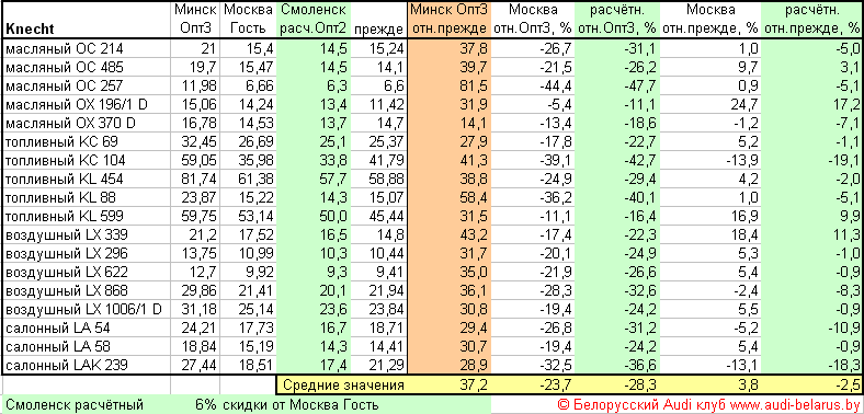Забавы ради сделал несколько проценок (Минск Опт3 и Москва Гость) на комплект фильтров Knecht к своей A6Q C4 2,5TDi и ещё несколько других: