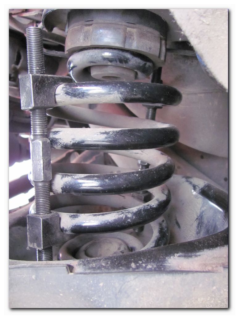Ставил себе проставки похожими съемниками. Авто на домкрате, по максимуму сжимал пружины, потом рукой вниз давил на подрамник (менял один, без помощника) и доставал пружину. Выходила довольно легко (и даже без матюков :) ), только важно её максимально сжать, иначе потом с проставкой всунуть обратно будет проблематично.